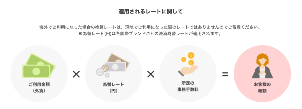 - 米ドル決済の場合: ショッピングや海外ATM利用で米ドルを指定すると、利用金額の2.50%の海外事務手数料がかかります(例: 100ドル利用で2.50ドル)。