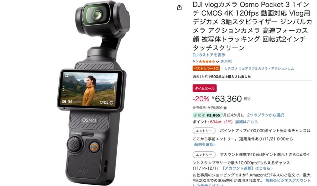 トヨタイムズのCMなどでもお馴染み、最強のV-log用カメラ『Osmo Pocket 3』が20%引きの過去最安での登場です。