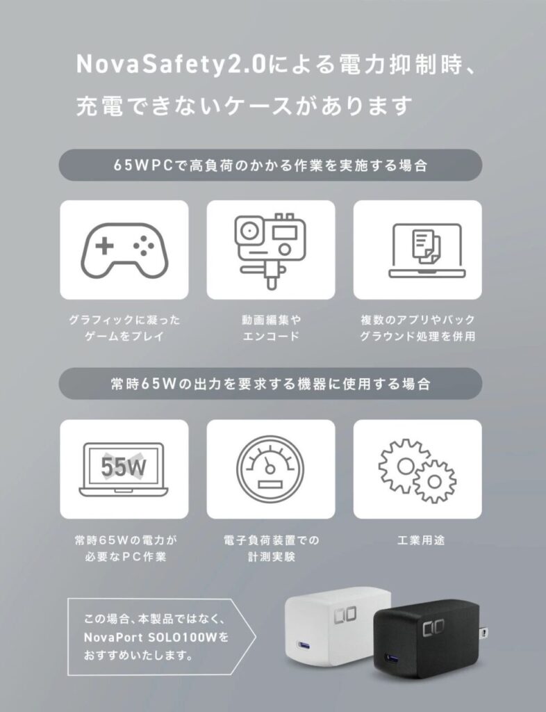 65W PD単ポート、CIO独自NovaSafety2.0搭載で発熱も制御されて安心。